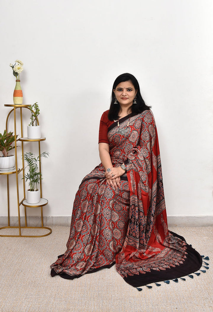 Red Ajrakh Printed Soft Gaji Silk Natural Print Saree